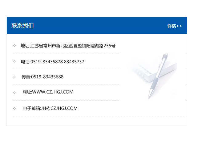 傳真:0519-83435688    郵編:213135    網址:WWW.czjhgj_com.hrbld.com    電子郵箱:JH@czjhgj_com.hrbld.com